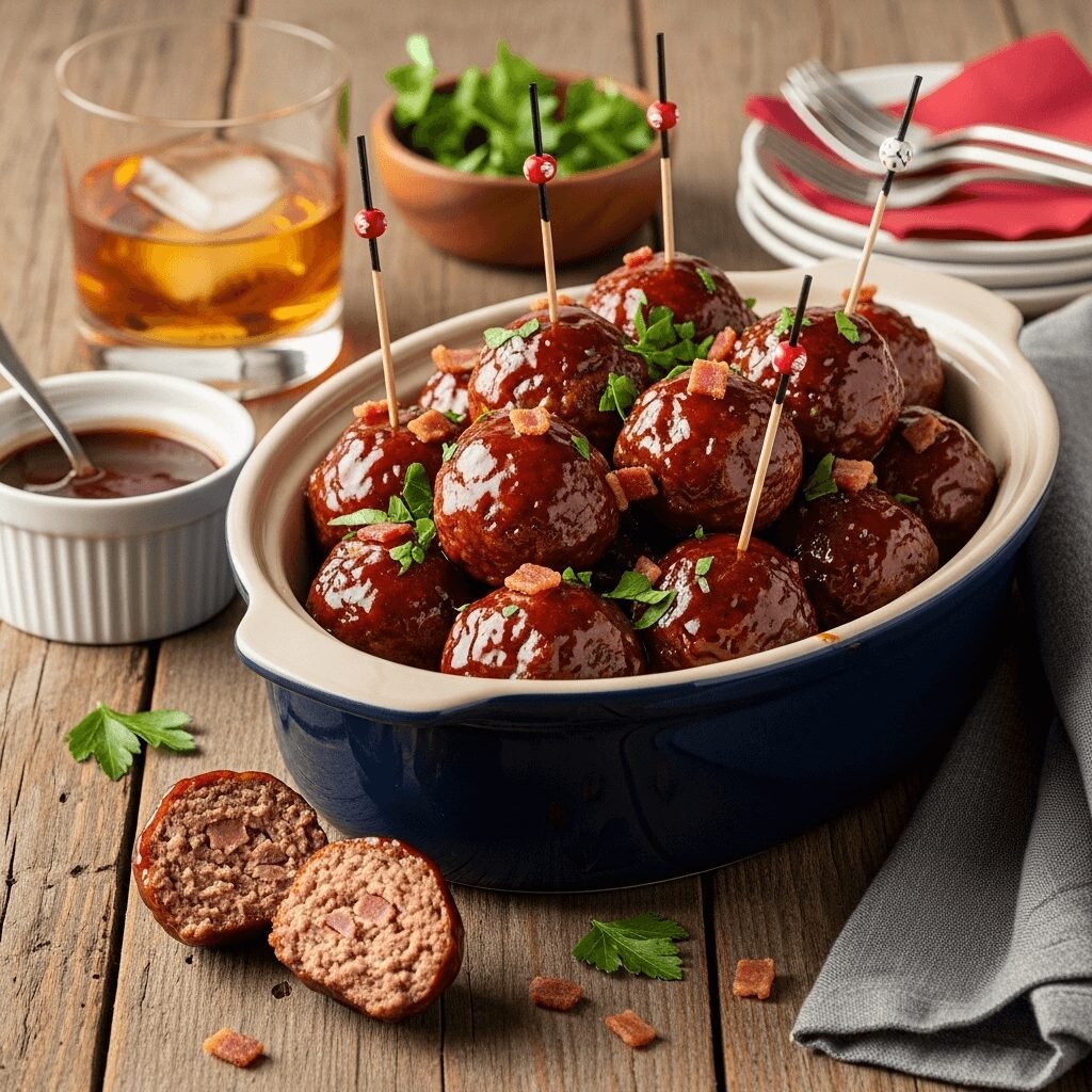 These irresistible bacon bourbon meatballs feature juicy, tender meatballs loaded with crispy bacon and coated in a rich, sweet-and-smoky bourbon glaze. Perfect for parties, game days, or any gathering where you need a crowd-pleasing appetizer that disappears fast!