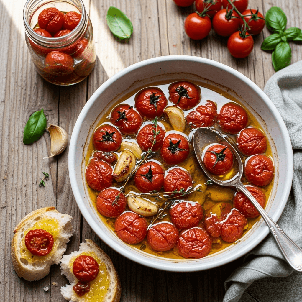 Choose the Right Vessel: The shape and material of your baking dish matters more than you’d think. A dish with higher sides retains heat better and requires less oil. Cast iron holds steady heat beautifully. Glass or ceramic works well too. Avoid metal sheet pans which can cause uneven heating and make the tomatoes roast rather than confit.