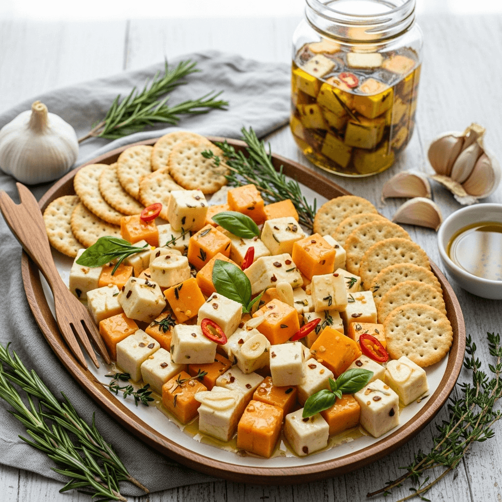 Q: Can I make this dairy-free or vegan? A: Yes, but with significant caveats. Plant-based cheese alternatives can be used, but the texture and flavor will be quite different from traditional cheese. Many vegan cheeses don’t firm up well when refrigerated in oil, and their flavors are distinct from dairy cheese. If you’re looking for a vegan option, try extra-firm tofu cut into cubes and marinated the same way—it absorbs flavors wonderfully and creates a similar texture experience, though obviously a different taste profile.