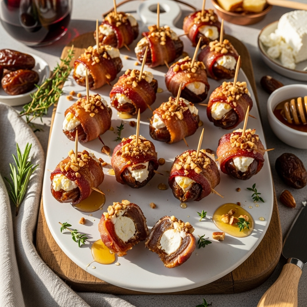 Day-Before Prep: For ultimate party ease, do all the prep work—pit dates, soften and portion cheese, toast and chop nuts, cut bacon—the day before. Assemble and bake day-of for best texture.